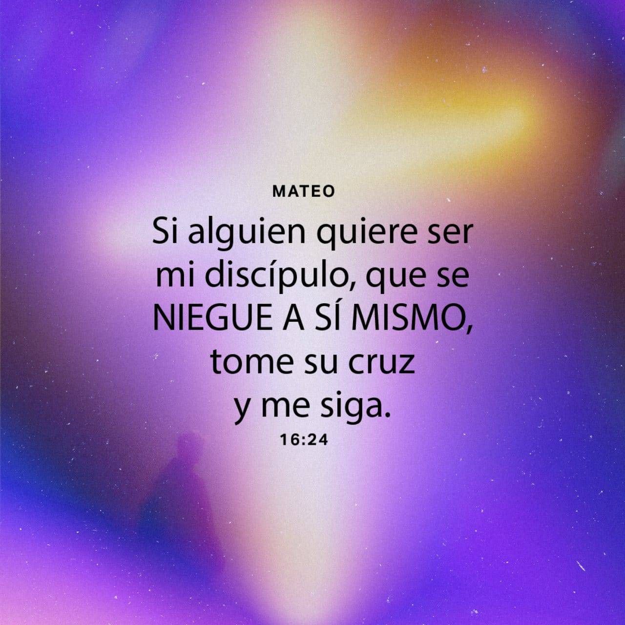 [24] Entonces Jesús dijo a Sus discípulos: «Si alguien quiere venir en pos de Mí, niéguese a sí mismo, tome su cruz y que me siga.